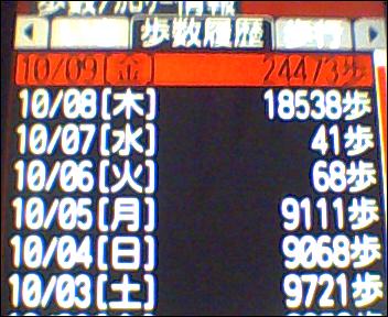 寝る前に万歩計機能のログを見ると今日は2万歩くらい歩いたらしい。火・水曜は謎の体調不良により部屋から出ていないので、CEATECに行った木・金曜日と比べるとその差は歴然。1日41歩って・・・(笑)。まあ、平均して1日だいたい10000歩は歩いている計算になります。ちなみに成人男性の1日の歩数は7500歩くらいらしい。もう少し歩かなきゃだめですね。